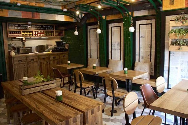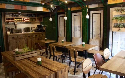 Над проектом работали профессиональные художники по интерьеру Григорий Галкин и Алена Сычева. Вдохновленные старинным потолком помещения, сохранившемся в первозданном виде, и современной философией кухни - они создали выразительный образ интерьера, способный вознести стрит-фуд на совершенно иной уровень.