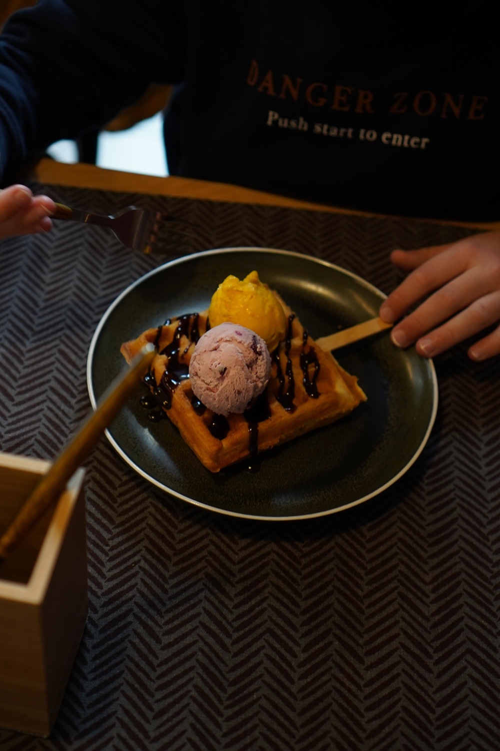 Сладкие вафли с мороженым, шоколадом с грушей и сыром дорблю, вафля-штрудель.