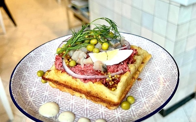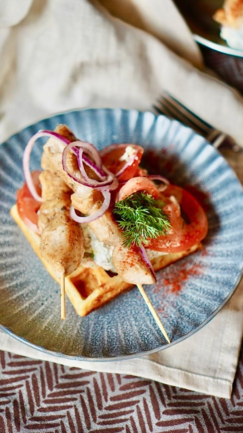 Соленые вафли: Вафли с куриным шашлычком, вафли с паштетом и брусничным соусом, вафля с селёдочкой и т.д.
