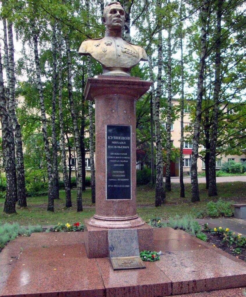 Бронзовый бюст Дважды Героя Советского Союза первоначально был воздвигнут на родине Михаила Васильевича Кузнецова в деревне Агарино (Серпуховский район) ещё при его жизни, в 1950 году. Когда в результате урбанизации в деревне не осталось жителей, было решено перенести памятник в город Пущино. Это произошло в 1981 году.