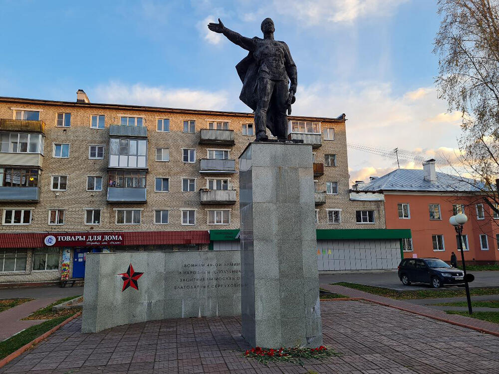 В 1966 году в Серпухове был установлен памятник воинам 49-й армии и народным ополченцам. Эта памятная скульптура, созданная известным художником Николаем Любимовым, стала одной из главных достопримечательностей. Центральная фигура монумента изображает солдата с автоматом в правой руке и поднятой левой, символизируя радость победы над фашистскими захватчиками.