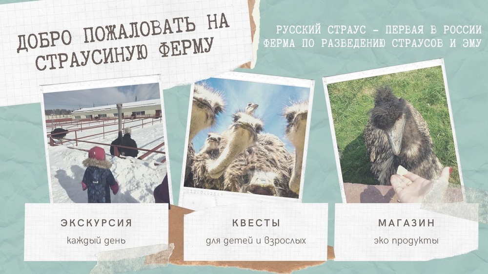 Строфокамил, стровион, струвь… что за странные слова? А может, знакомым кажется название «верблюжий воробей»? Тоже нет… На самом деле все это названия страуса, крупной нелетающей птицы родом из жаркой Африки. Чтобы познакомиться поближе с этим верблюдом среди пернатых, посетите с ребенком страусиную ферму “Руский страус” в деревне Старые Кузьменки.