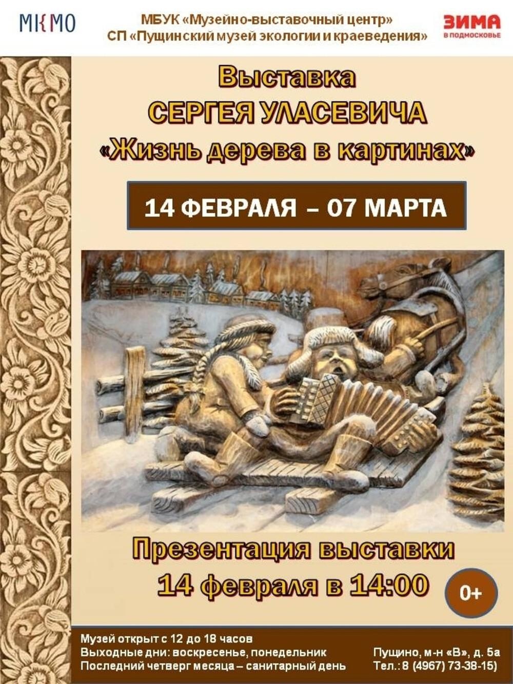 Пущинский музей экологии и краеведения приглашает посетить персональную выставку самодеятельного художника, мастера художественной резьбы из дерева Сергея Уласевича «Жизнь дерева в картинах».